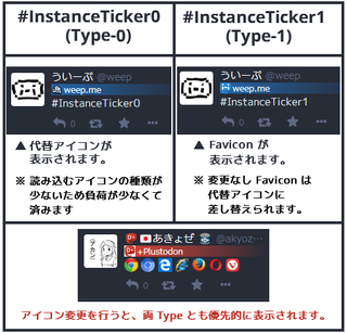 - 2019年01月24日 - Favicon キャッシュ機能が正常に動くようになり公開し、PHP構成もいろいろと複雑化したことと、状況をまとめるために、「InstanceTicker Wiki」(GitHub Wiki上) を開設し、解説ページをすべてそこに移転(のちに更新停止)。