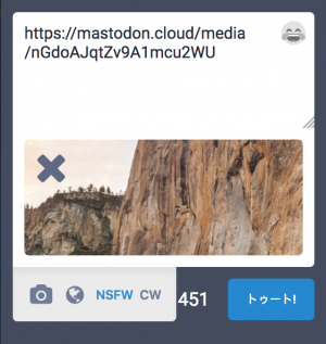 尚、NSFWの設定方法は画像のアップロード後に設定ボタンが出現するため、初期のトゥート画面では表示されない。
